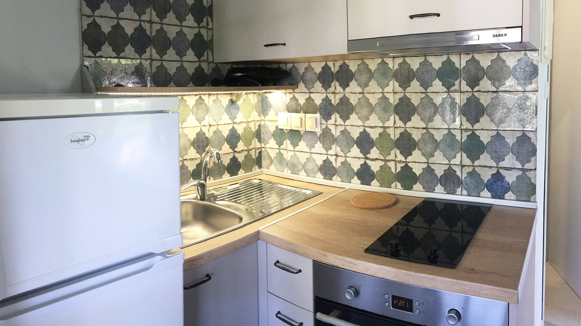 Η κουζίνα διαθέτει όλο τον απαραίτητο εξοπλισμό όπως και τις απαραίτητες συσκευές (ηλεκτρικός φούρνος, κεραμικές εστίες, ψυγειοκαταψύκτης κανονικού μεγέθους, μηχανή καφέ φίλτρου, τοστιέρα).